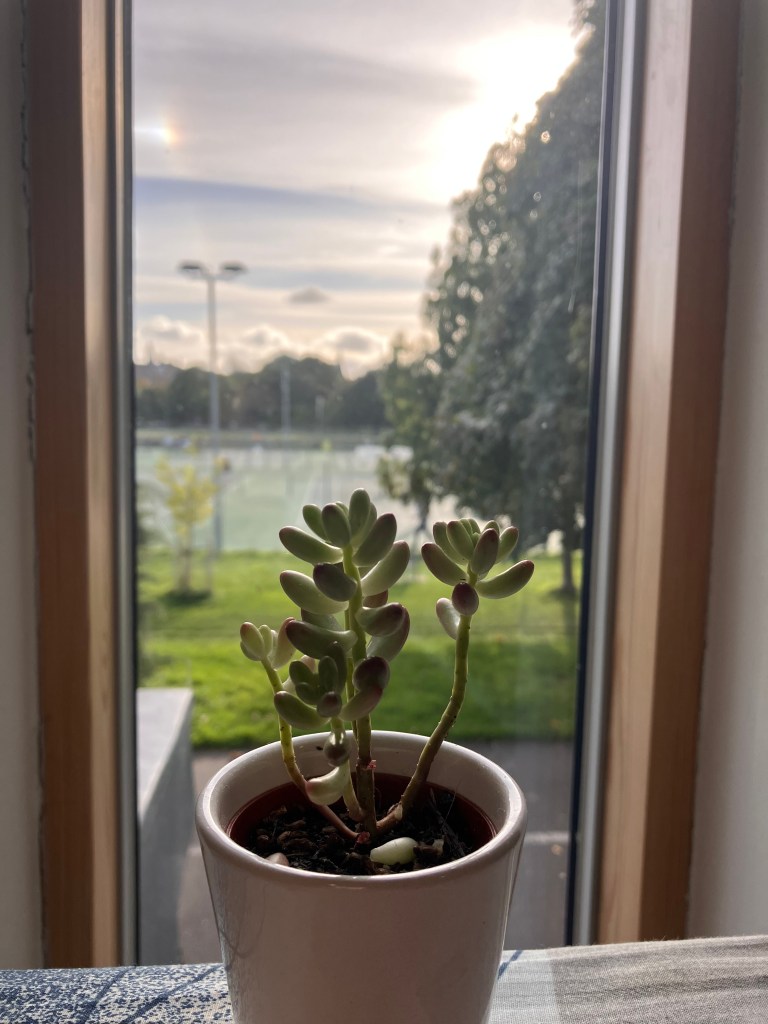 My plants are in the hallways strategically placed to receive the afternoon sunshine from the only southwest facing window in the flat. They didn’t sign up for a postgraduate program, so they shouldn’t have to grow pale in color and miss out on the beautiful weather too. I am a very empathetic plant owner.