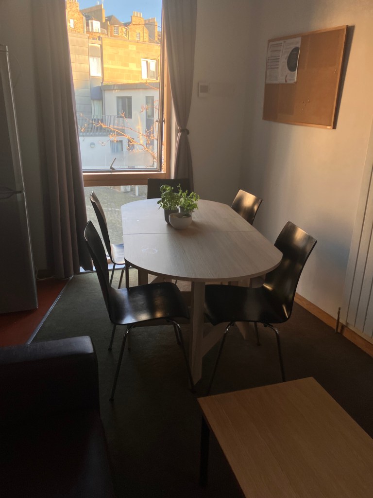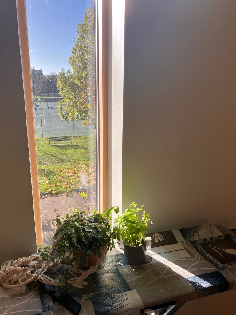 I made sure to be in my room by the time the clock struck 9 am. In the months staying here, I have lamented the fact that most of my flat’s windows face north. My dream home is bathed in natural sunlight. As if I wasn’t already having to battle for sunlight in Scotland, the architect of my flat made sure the flat was a cave except for the sliver of a window in the hallway that I attribute the health of my plants to. However, at 9 am every morning, the window of the opposite apartment complex reflects the sun directly into my room, giving the illusion that the morning sun is invading, warming the space.