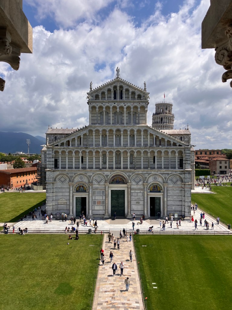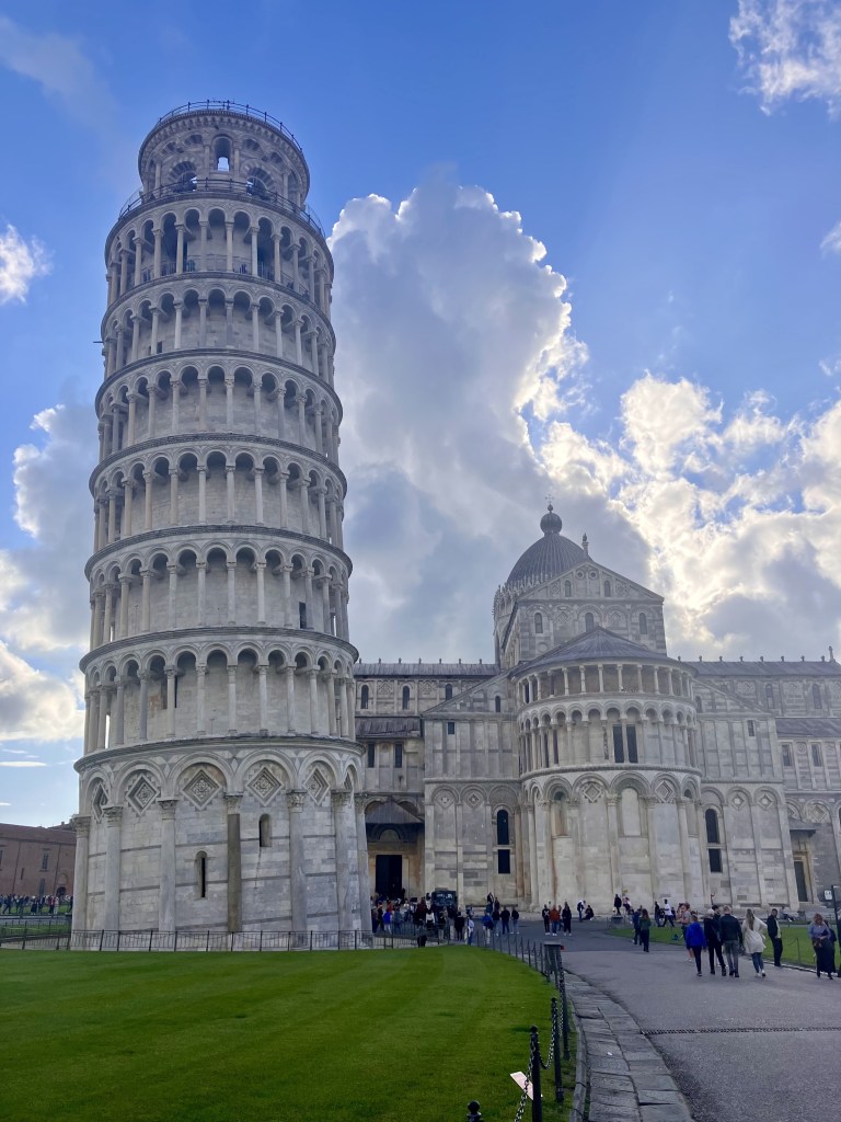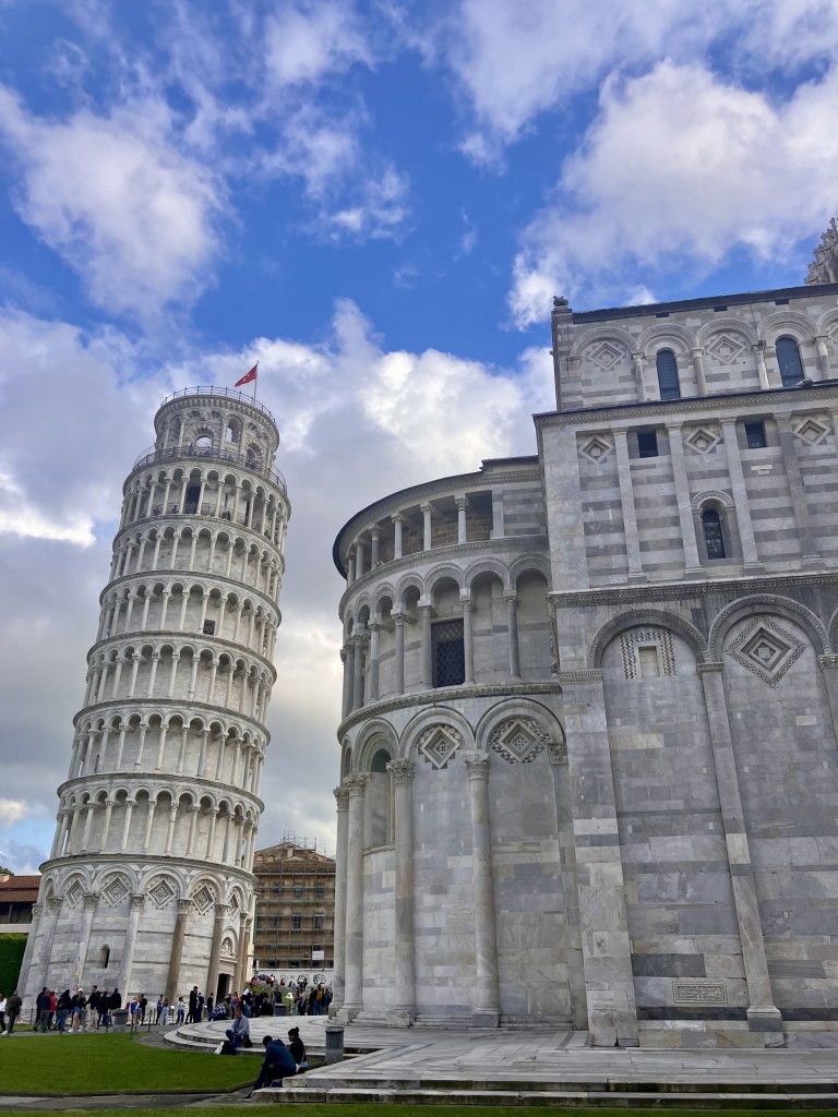 I purchase a few postcards (some of you should expect mail) and continue on my way, clearing my mind with the fresh air and starting to find my way back to the flat. On the opposite side of the river, I navigate through a maze of streets. When I glance up, I spot a white marbled tower with a flag bearing the Pisan Cross, peering over the rooftops. The tower doesn’t appear perfectly straight.